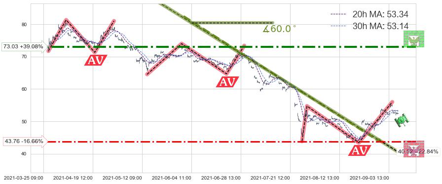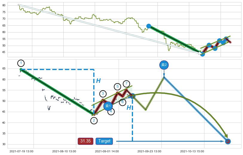 从2021-06-01 13:00至2021-08-31 12:00,共包含397个小时,阶段股价下跌-33.62%,阶段股价变动位移路程比: 1 : 6,下跌趋势角度: 54.6