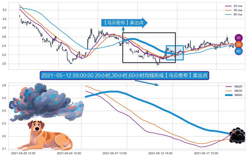 ⚀ 2021-05-04 14:00:00小时-2021-05-19 09:00:00小时显现 20小时-30小时-60小时均线 【乌云密布】卖出点 看空信号,后市看跌,卖出