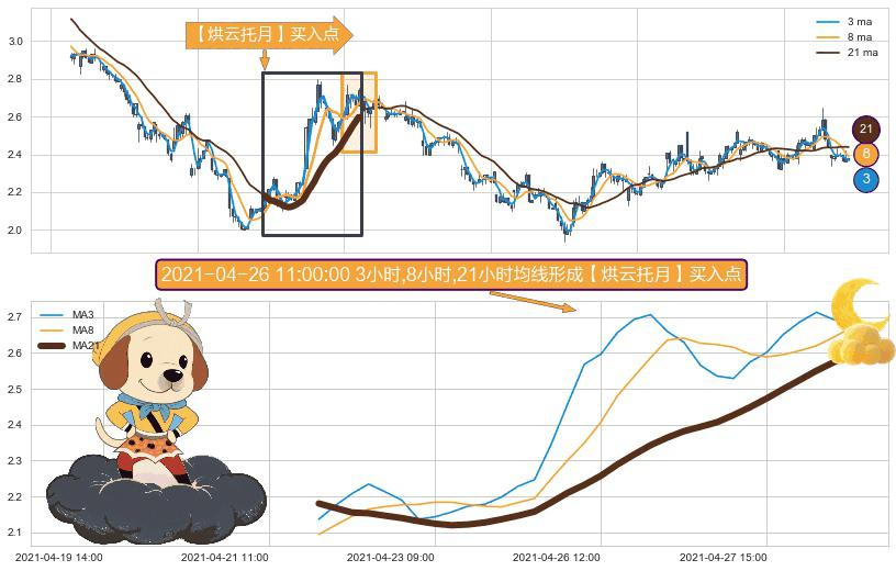 ⚀ 2021-04-21 14:00:00小时-2021-04-28 13:00:00小时显现 3小时-8小时-21小时均线 【烘云托月】买入点 看多信号,后市看涨,买入