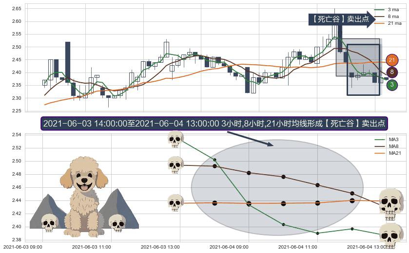 ⚀ 2021-06-04 09:00:00-小时至2021-06-04 13:00:00-小时显现 3小时-8小时-21小时均线 【死亡谷】卖出点 看空信号,后市看跌,卖出