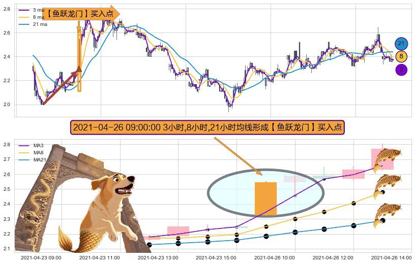 ⚀ 2021-04-26 09:00:00小时显现 3小时-8小时-21小时均线 【鱼跃龙门】买入点 看多信号,后市看涨,买入
