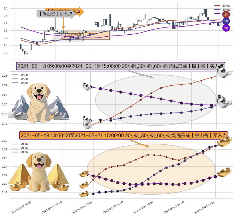 ⚀ 2021-05-18 14:00:00-小时至2021-05-21 15:00:00-小时显现 20小时-30小时-60小时均线 【金山谷】买入点 其再次确认了买入信号,可靠性更强,买入