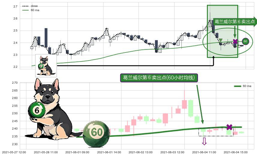 ⚀ 2021-06-04 09:00:00-小时显现 葛兰威尔均线 60小时均线 第⑥卖出点 走势反转见顶信号,后市看跌,卖出信号