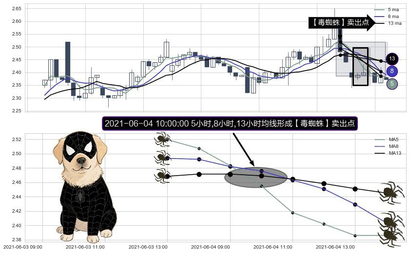 ⚀ 2021-06-04 10:00:00小时显现 5小时-8小时-13小时均线 【毒蜘蛛】卖出点 看空信号,后市看跌,卖出