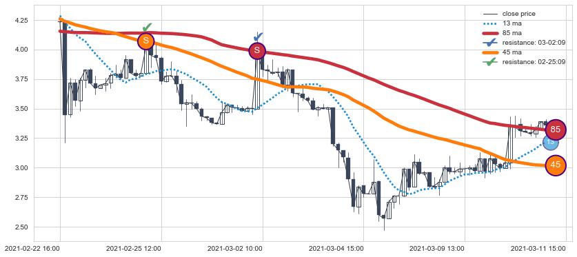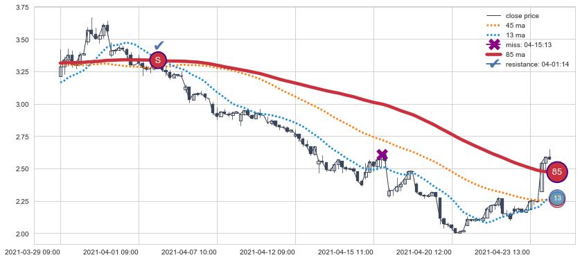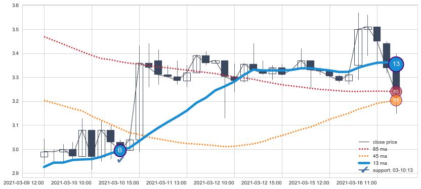 ⚁ MA3和MA8走势平行,且始终保持在短距离内,MA21始终在短中期均线下方,与短中期均线保持一定的距离,微微上行