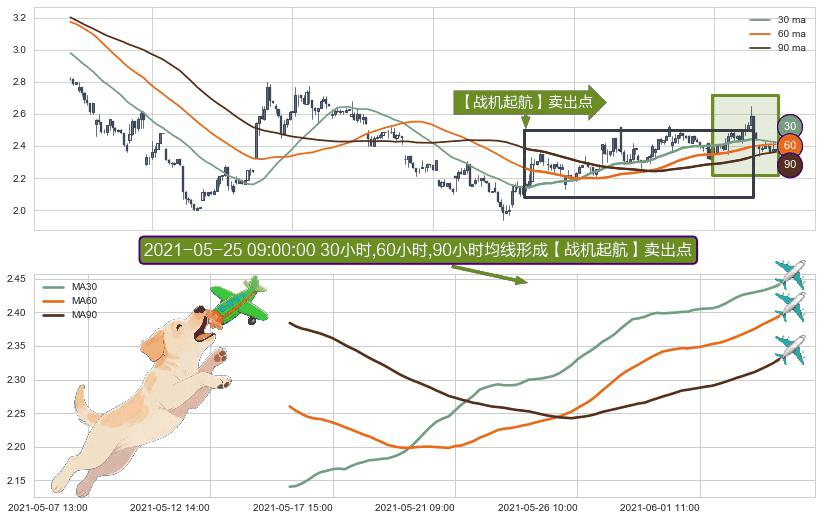 ⚀ 2021-05-14 14:00:00小时-2021-06-03 12:00:00小时显现 30小时-60小时-90小时均线 【战机起航】卖出点 看空信号,后市看跌,卖出