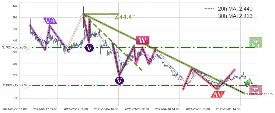 ♘ 支撑价格位2.063,可信任强度73.40%,距离最后交易2021-06-04 15:00形成的收盘价格2.370相差 -12.97%