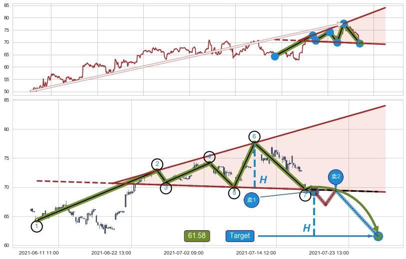 ➢ 最小反转跌幅→𝐇: 7.72 (逐步抬高阻力斜边最后的阻力点⑥与支撑边垂直距离)