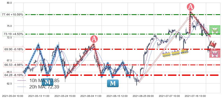 ♘ 支撑价格位69.90,可信任强度70.45%,距离最后交易2021-07-19 15:00形成的收盘价格70.02相差 -0.18%