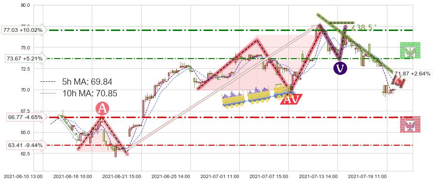 ➢ 预测:2021-07-20 12:00,【小幅反弹】稳定目前下跌趋势的前提下,预测价格:71.15