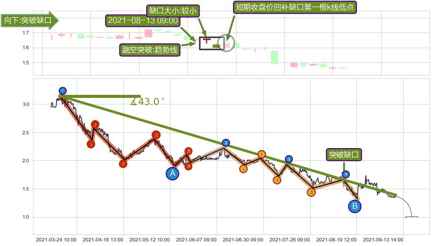 从2021-03-16 11:00至2021-08-24 13:00,共包含655个小时,阶段股价下跌-52.76%,阶段股价变动位移路程比: 1 : 15,下跌趋势角度: 43.0