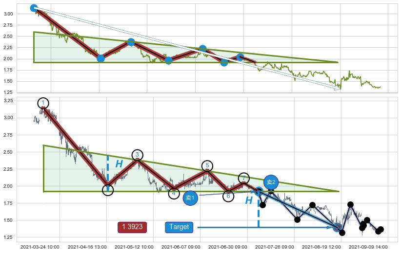 ➣ 【已确认突破】下降三角形整理 起点:03-16:11,突破点:07-07:09,形态共460交易小时