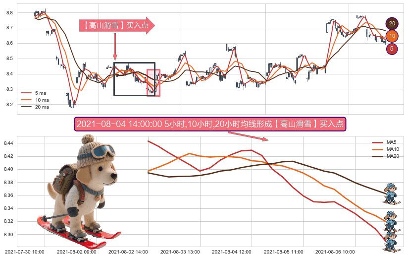 ⚀ 2021-08-02 14:00:00小时-2021-08-06 13:00:00小时显现 5小时-10小时-20小时均线 【高山滑雪】买入点 看多信号,后市看涨,买入