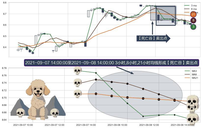 ⚀ 2021-09-08 09:00:00-小时至2021-09-08 14:00:00-小时显现 3小时-8小时-21小时均线 【死亡谷】卖出点 看空信号,后市看跌,卖出