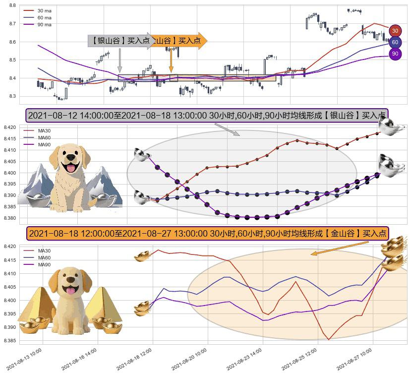 ⚀ 2021-08-18 13:00:00-小时至2021-08-27 13:00:00-小时显现 30小时-60小时-90小时均线 【金山谷】买入点 其再次确认了买入信号,可靠性更强,买入