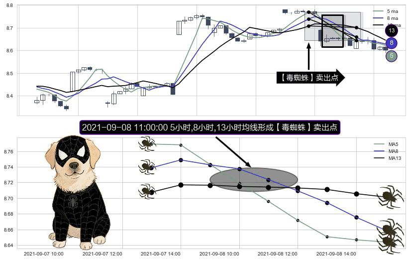 ⚀ 2021-09-08 11:00:00小时显现 5小时-8小时-13小时均线 【毒蜘蛛】卖出点 看空信号,后市看跌,卖出