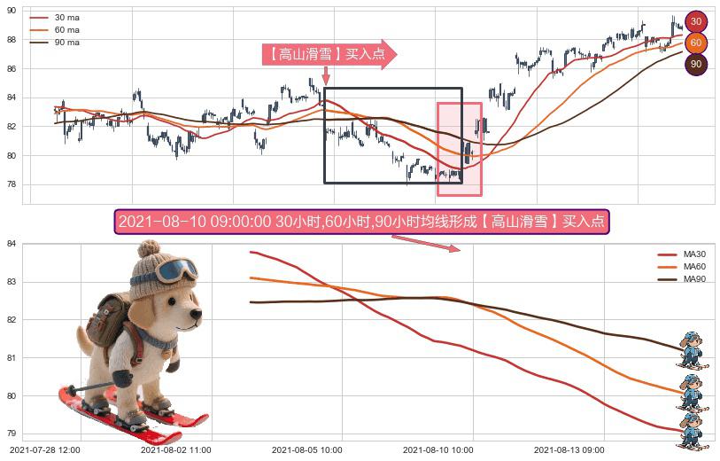 ⚀ 2021-08-03 10:00:00小时-2021-08-16 14:00:00小时显现 30小时-60小时-90小时均线 【高山滑雪】买入点 看多信号,后市看涨,买入