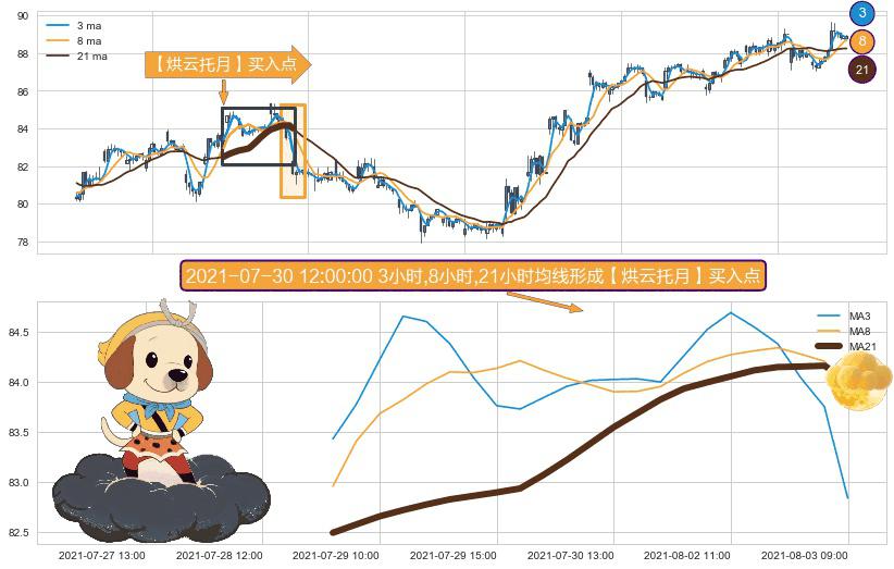 ⚀ 2021-07-28 15:00:00小时-2021-08-03 09:00:00小时显现 3小时-8小时-21小时均线 【烘云托月】买入点 看多信号,后市看涨,买入