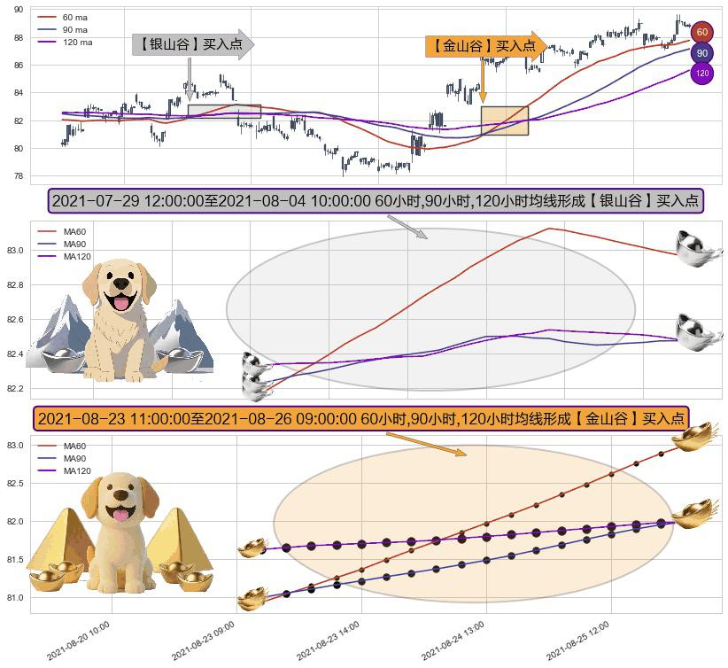 ⚀ 2021-08-23 12:00:00-小时至2021-08-26 09:00:00-小时显现 60小时-90小时-120小时均线 【金山谷】买入点 其再次确认了买入信号,可靠性更强,买入