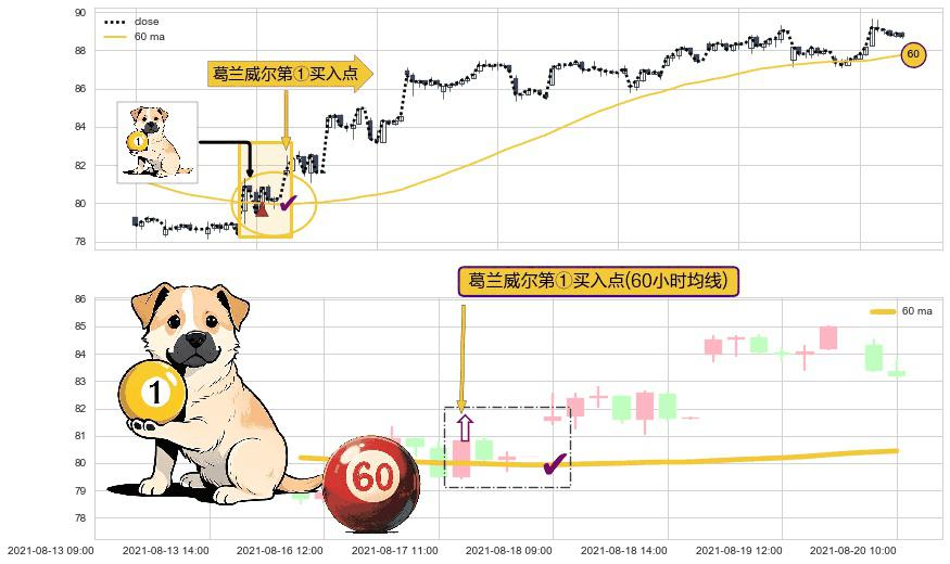 ⚀ 2021-08-17 12:00:00-小时显现 葛兰威尔均线 60小时均线 第买①入点 走势反转见底信号,后市看涨,买进信号
