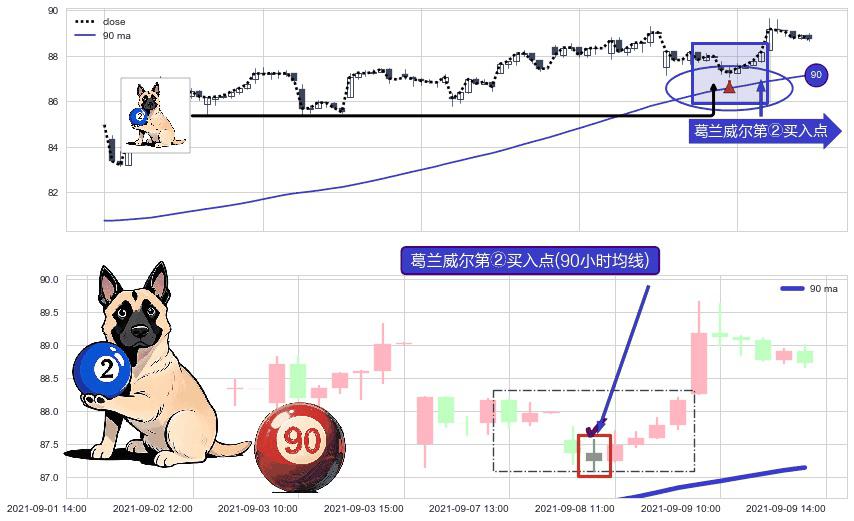 ⚀ 2021-09-08 10:00:00-小时显现 葛兰威尔均线 90小时均线 第②买入点 上升趋势的中继信号,后市看涨,买进信号