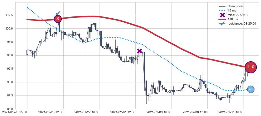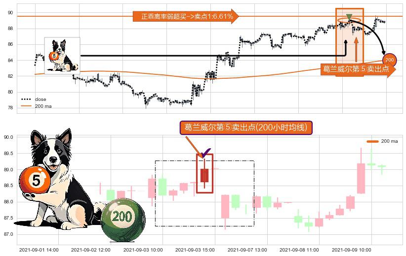 ⚀ 2021-09-03 14:00:00-小时显现 葛兰威尔均线 200小时均线 第⑤卖出点 上升趋势均值回复的短线回落信号,后市看跌,卖出信号