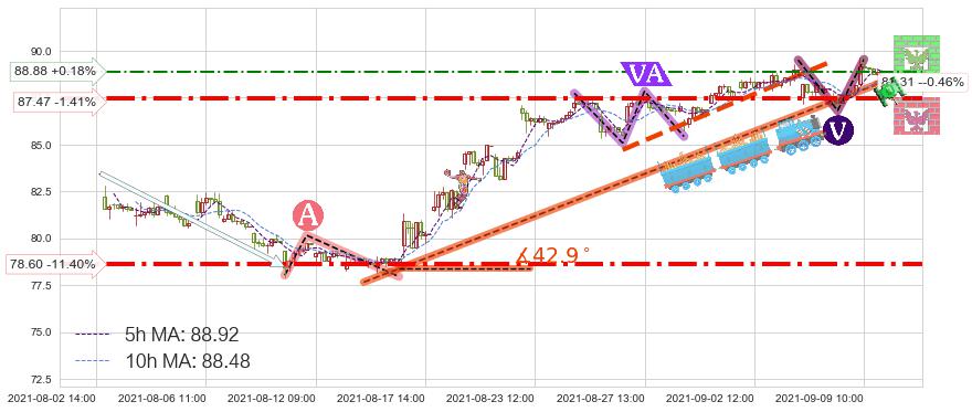 ♘ 阻力价格位88.88,可信任强度53.09%,距离最后交易2021-09-09 14:00形成的收盘价格88.72相差 +0.18%