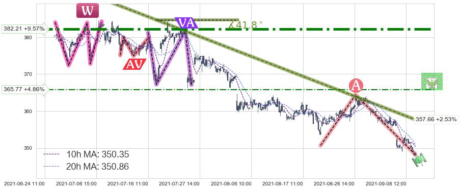 ♘ 阻力价格位365.77,可信任强度52.88%,距离最后交易2021-09-09 14:00形成的收盘价格348.82相差 +4.86%