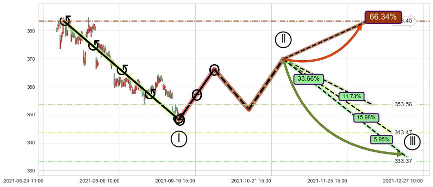➢ 循环浪继续向下【最高】位置(12-08:10, 353.56),匹配聚类样本比例34.84%, 可能性概率11.73%