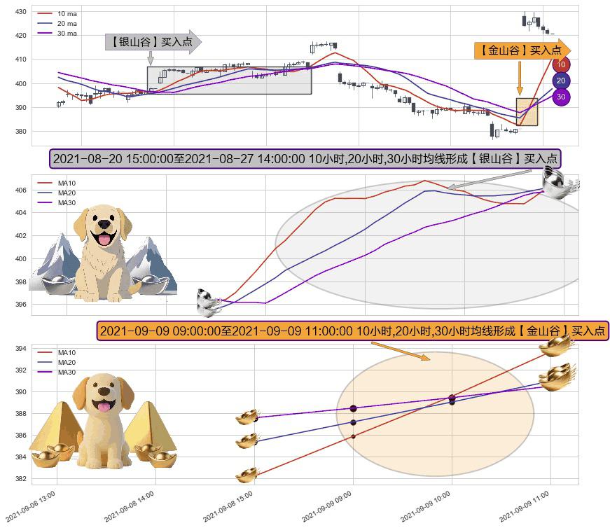 ⚀ 2021-09-09 10:00:00-小时至2021-09-09 11:00:00-小时显现 10小时-20小时-30小时均线 【金山谷】买入点 其再次确认了买入信号,可靠性更强,买入