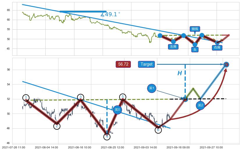 从2021-05-27 14:00至2021-07-21 10:00,共包含244个小时,阶段股价下跌-15.31%,阶段股价变动位移路程比: 1 : 6,下跌趋势角度: 54.3