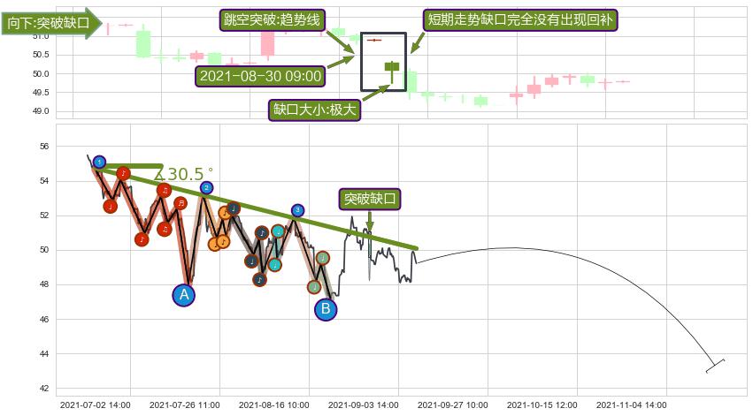 从2021-06-24 14:00至2021-08-24 11:00,共包含282个小时,阶段股价下跌-6.61%,阶段股价变动位移路程比: 1 : 20,下跌趋势角度: 30.5,2021-07-19 09:00向↘︎形成缺口,跳空下跌-3.85%˚