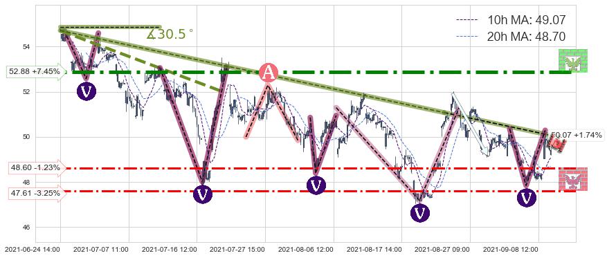 🦴 长线均值回复组合短线趋势跟踪[强阻力信号]2021-06-24 14:00-2021-08-24 11:00下跌趋势依然成立(下跌趋势跟踪依然存在),短线价格略微上行反弹(均值回复猜想),即将接近下跌趋势提供的未破位阻力价格:50.07。