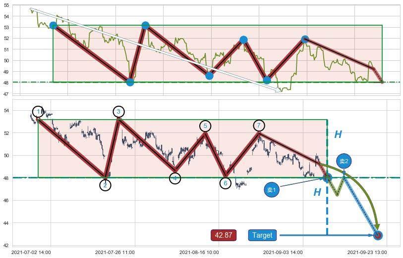 ➣ 最小中继整理跌幅→𝐇: 6.80 (下侧直角边第一支撑点②与斜边垂直距离)