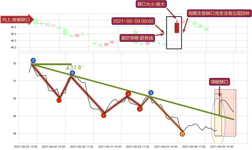 ➣ 2021-08-25 10:00-2021-09-07 13:00下跌趋势存在反转上涨[机会],其原下跌趋势的阻力位(48.79)已被突破[强支撑信号],原下跌趋势角度: 37.8˚