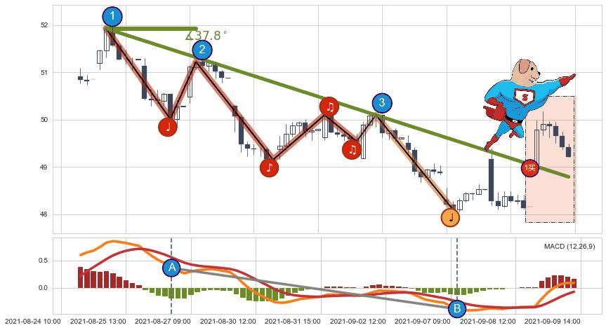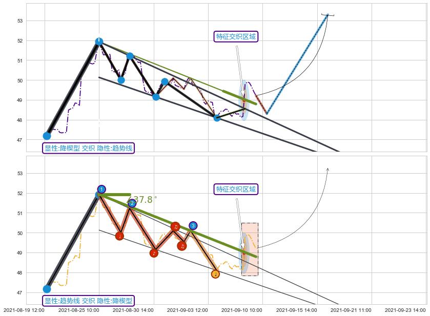 从2021-08-25 10:00至2021-09-07 13:00,共包含58个小时,阶段股价下跌-6.88%,阶段股价变动位移路程比: 1 : 3,下跌趋势角度: 37.8