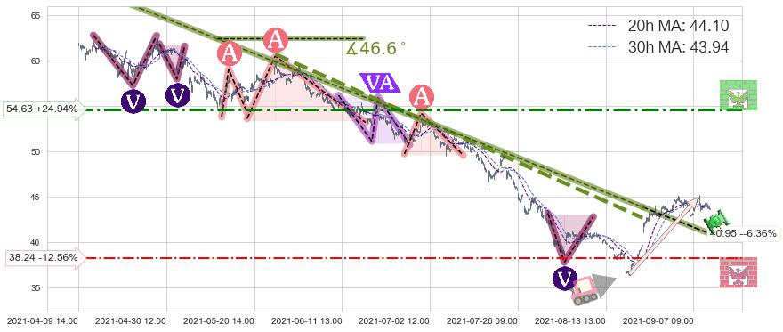 从2021-04-09 14:00至2021-08-23 15:00,共包含643个小时,阶段股价下跌-42.53%,阶段股价变动位移路程比: 1 : 7,下跌趋势角度: 46.6