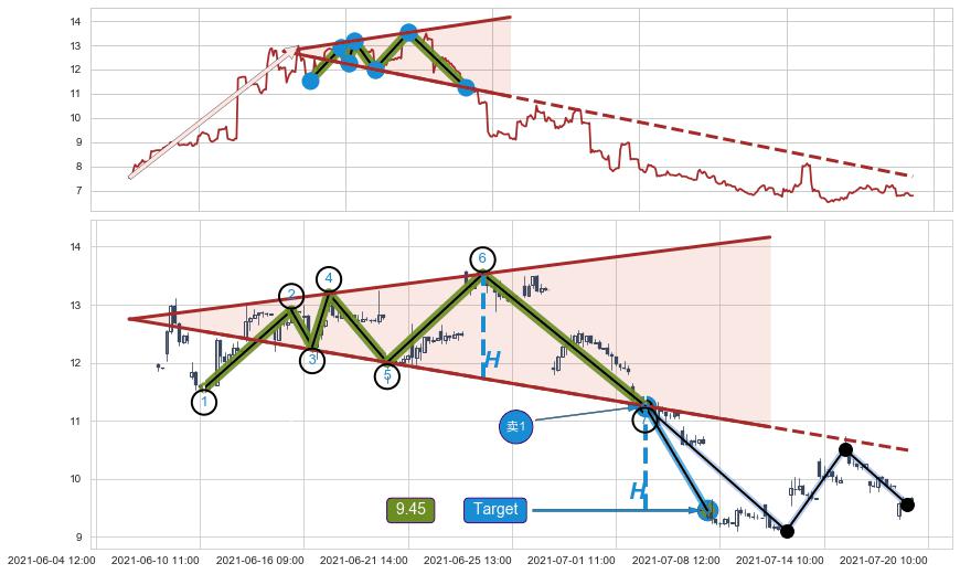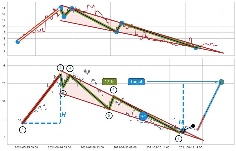 ➢ 最小中继整理涨幅→𝐇: 5.46 (𝐇楔型旗杆的长度:楔型起点→顶点)