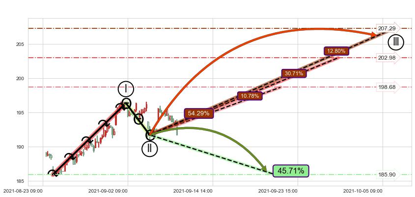 ♘ 支撑价格位185.85,可信任强度95.28%,距离最后交易2021-09-09 14:00形成的收盘价格191.74相差 -3.07%