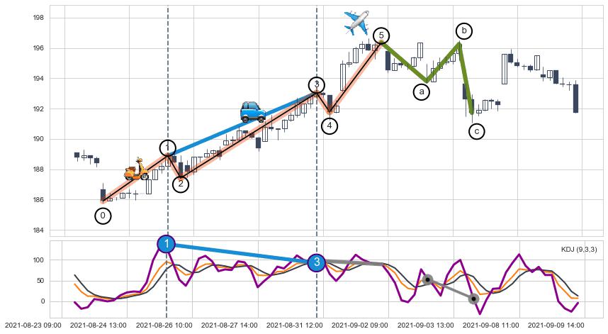 ➢ 第一, 三驱动浪端点:【KDJ】走势出现【常规背离 & 反转信号】背离程度57.86%,背离夹角角度79.9˚,背离程度中等