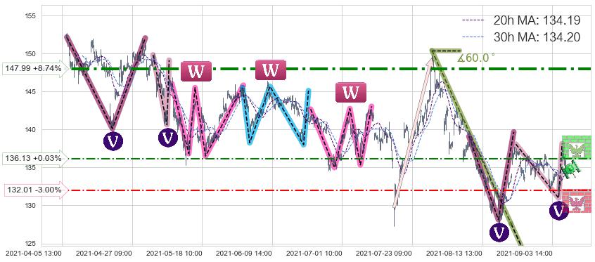 ♘ 阻力价格位136.13,可信任强度51.21%,距离最后交易2021-09-09 14:00形成的收盘价格136.09相差 +0.03%