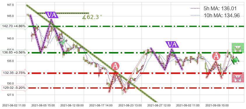 ♘ 阻力价格位136.85,可信任强度89.47%,距离最后交易2021-09-09 14:00形成的收盘价格136.09相差 +0.56%