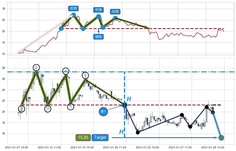 ➢ 【卖1】: 激进型 卖点→(01-20:10: 21.27 )形成突破三重顶【反转】形态