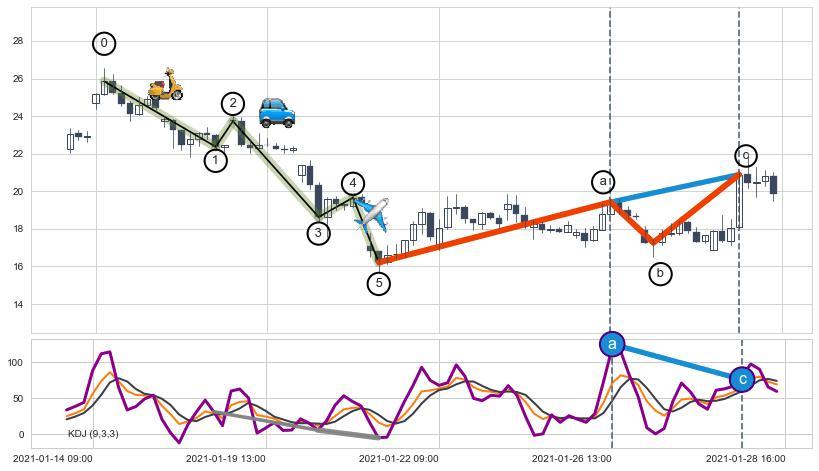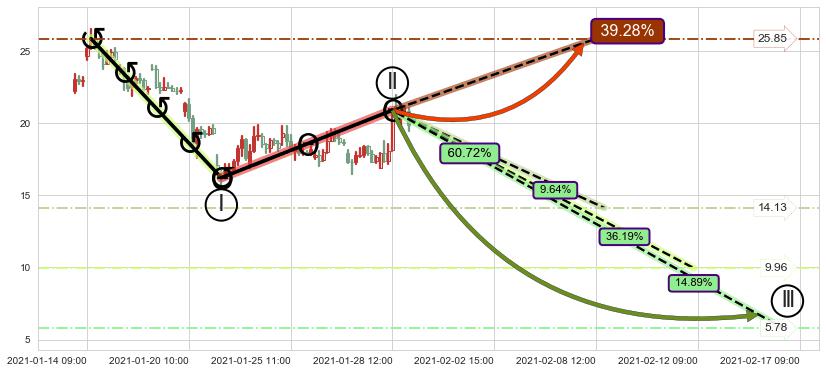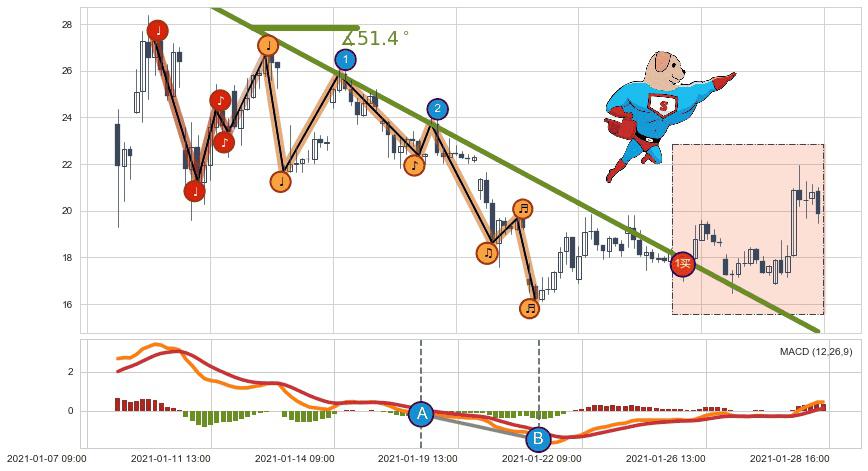从2021-01-12 14:00至2021-01-22 09:00,共包含52个小时,阶段股价下跌-33.80%,阶段股价变动位移路程比: 1 : 4,下跌趋势角度: 58.3,2021-01-13 09:00向↘︎形成缺口,跳空下跌-17.00%˚