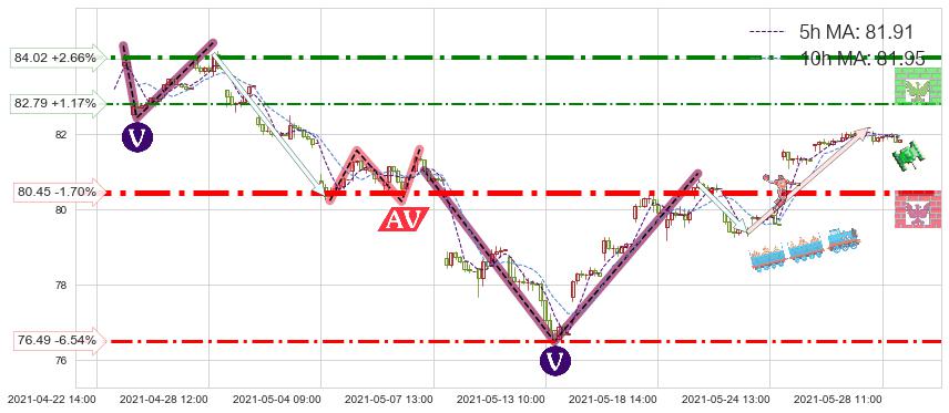 ♘ 阻力价格位82.79,可信任强度51.98%,距离最后交易2021-05-28 15:00形成的收盘价格81.84相差 +1.17%