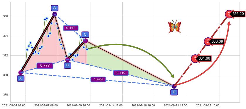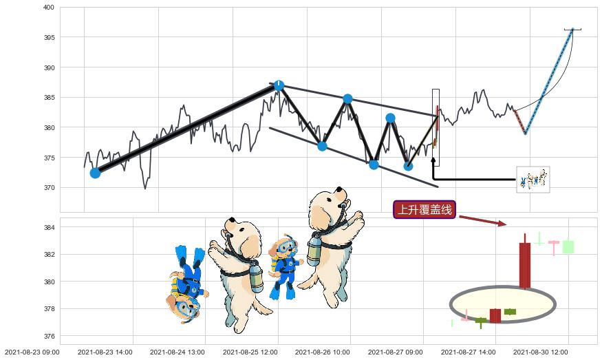 ➣ D点拟合预测价格378.85,距离最后交易收盘价格382.66相差 -1.00%