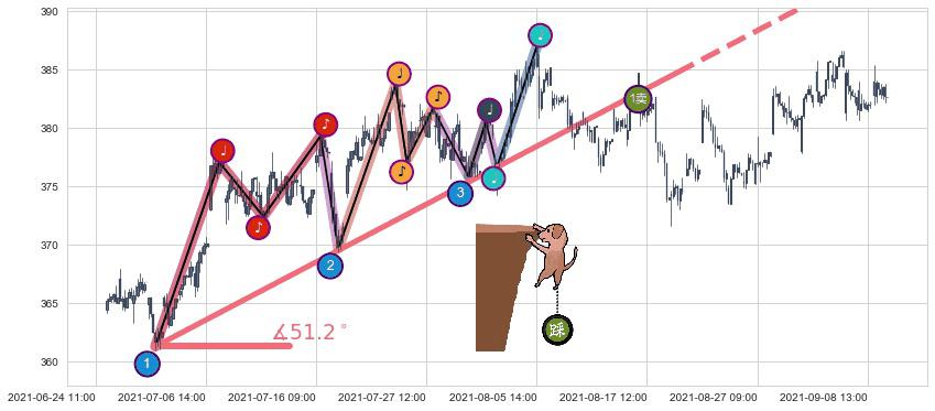 从2021-06-30 12:00至2021-08-19 11:00,共包含237个小时,阶段股价上涨3.89%,阶段股价变动位移路程比: 1 : 14,上涨趋势角度: 51.2