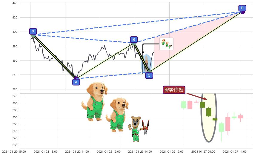➣ D点拟合预测价格427.87,距离最后交易收盘价格371.30相差 +15.24%