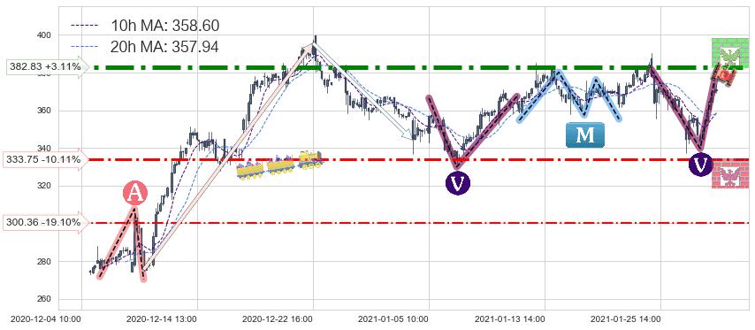 ♘ 支撑价格位333.75,可信任强度68.64%,距离最后交易2021-01-28 16:00形成的收盘价格371.30相差 -10.11%
