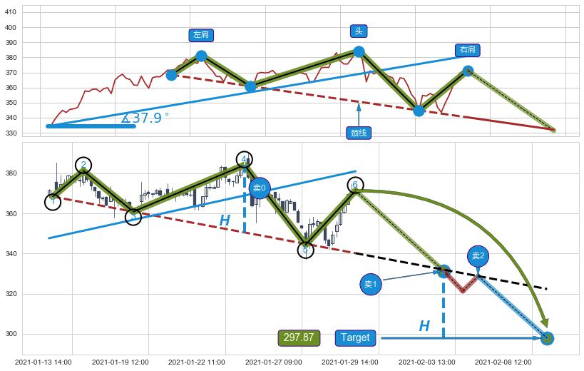 ➣ 最小反转跌幅→𝐇: 33.54 (头部与颈线垂直距离)